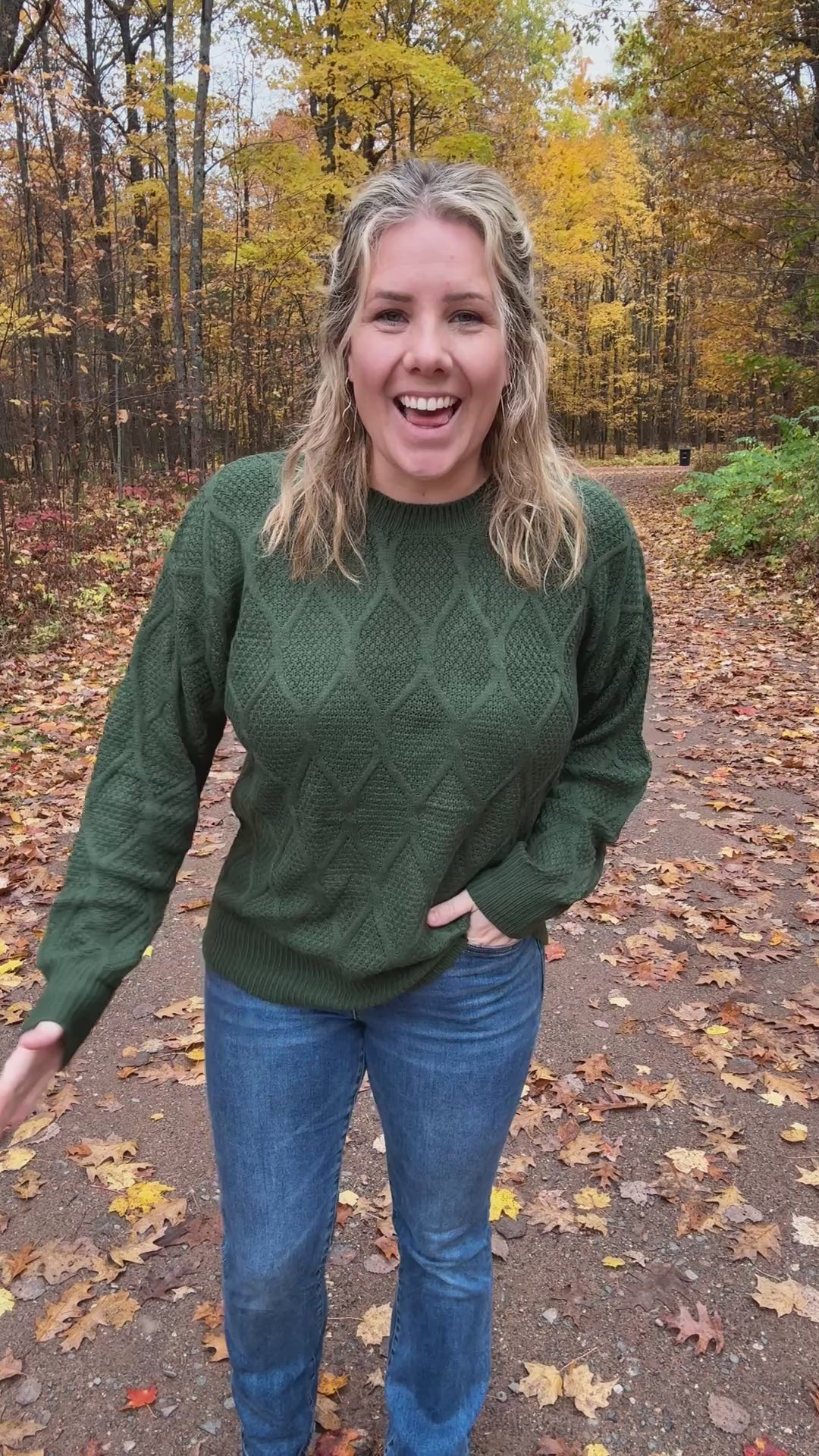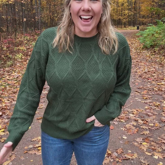 Stay stylish and cozy this Fall with our Carson Pullover in Green. Embrace the season with its diamond design, perfect for pairing with dark jeans and fall booties. Don't forget to add a touch of quirk to your wardrobe this season. Although this pullover doesn't have a soft sweater like fabric in the interior it offers a more lightweight knit fabric perfect for layering!