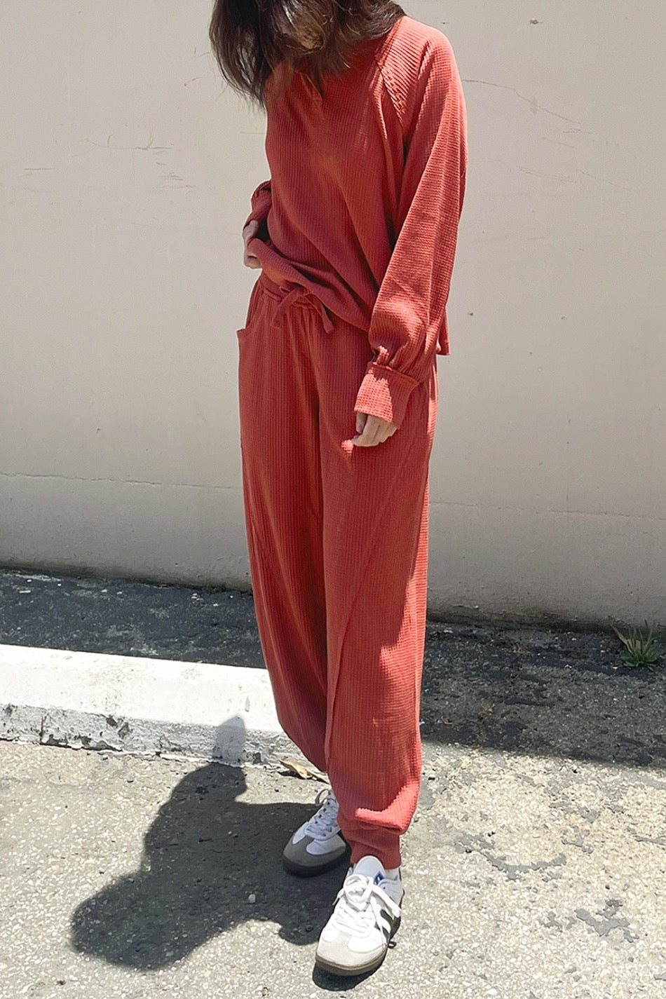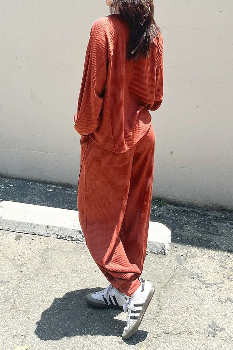 Soft, sculpted, and slightly unexpected—these cocoon-inspired joggers bring texture and ease together in all the right ways. Crafted from lightweight waffle fabric with pleated details and raw edges, they strike a perfect balance between laid-back and artfully styled. A relaxed essential with just enough shape.