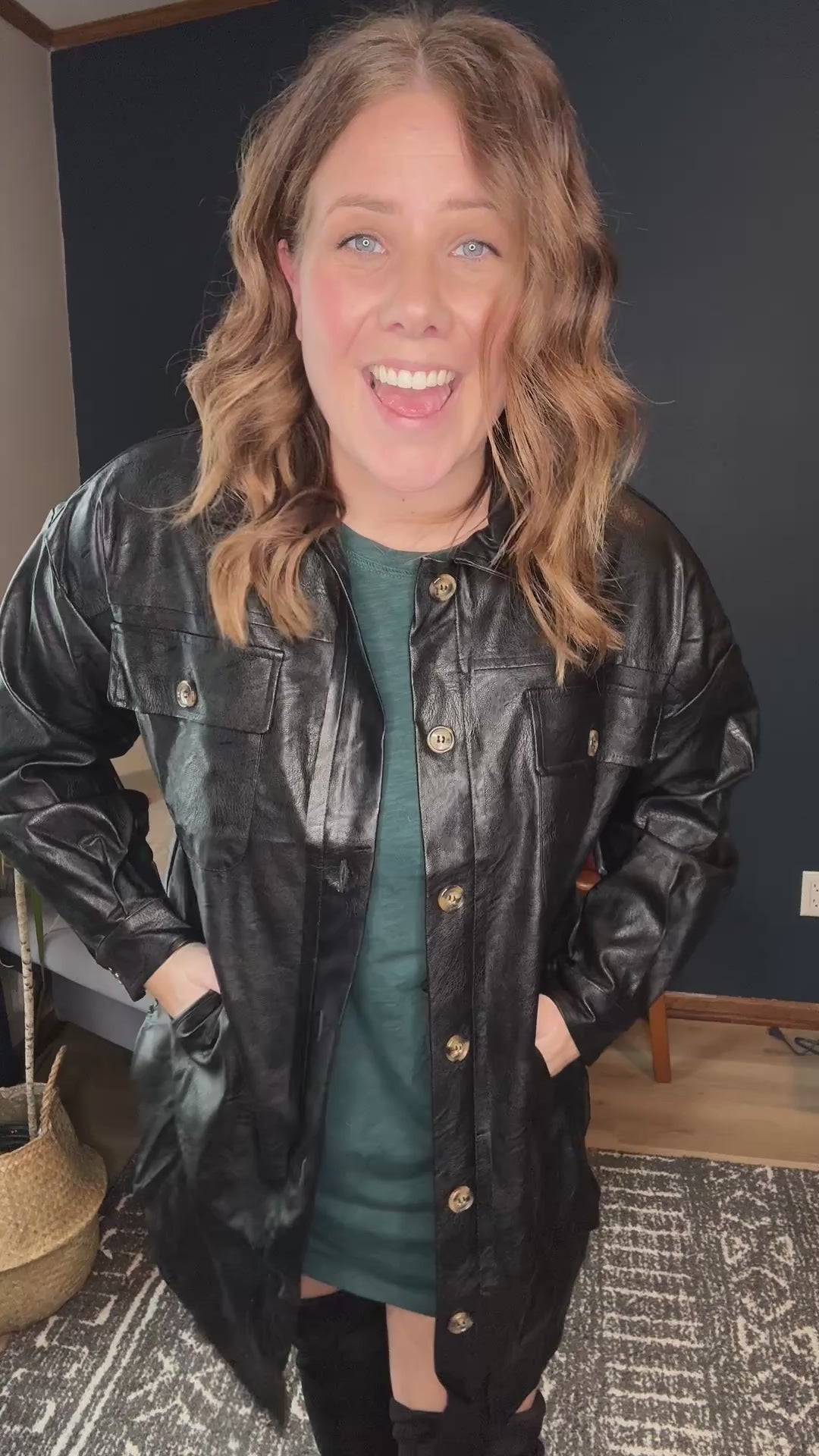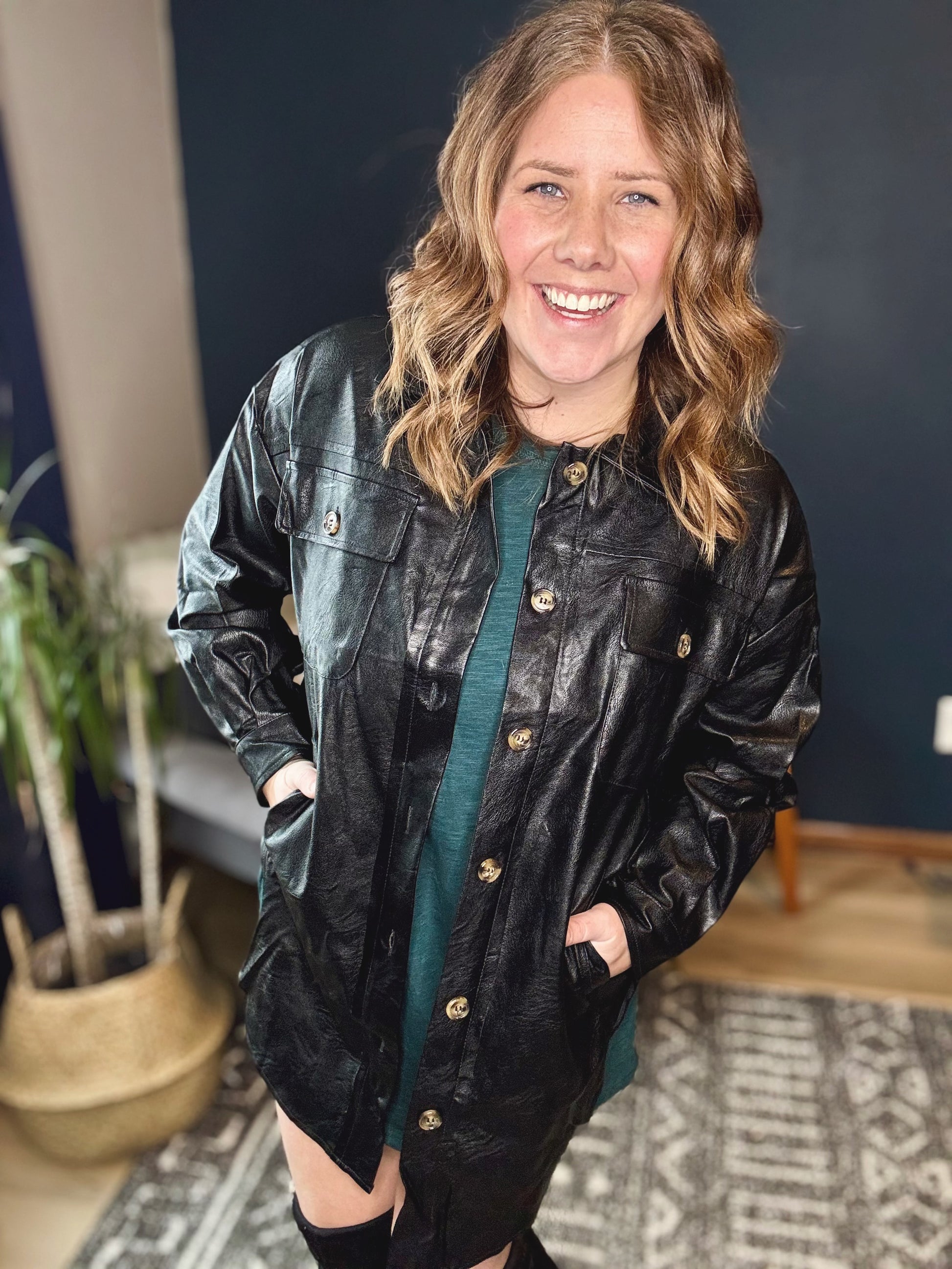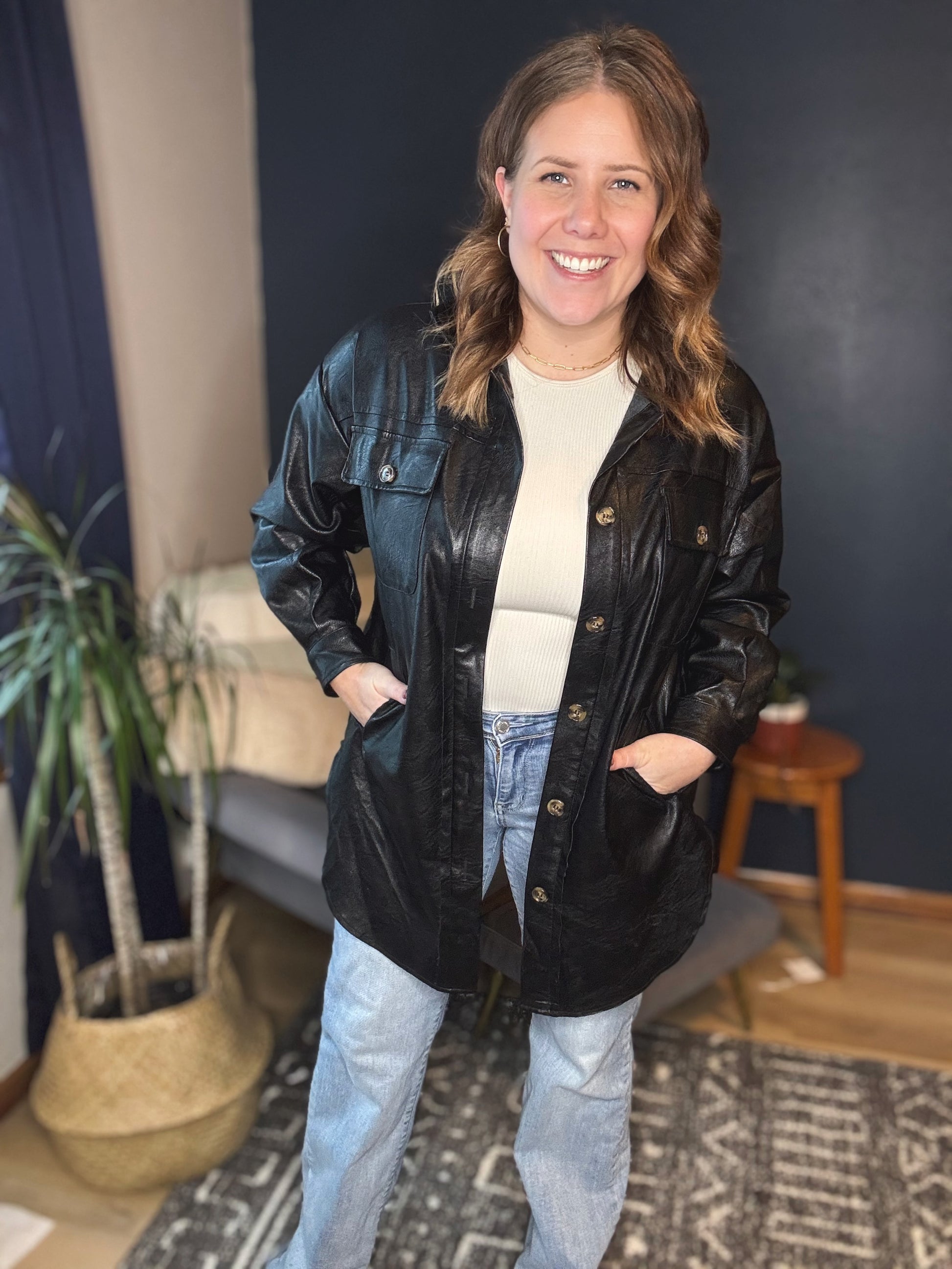 This shirt jacket (shacket) is the perfect combination of edgy and sophisticated. Pair this one with jeans, a solid color top and your favorite boots, or throw it on with some leggings, a graphic tee and some sneakers! You have a lot of options with this one!