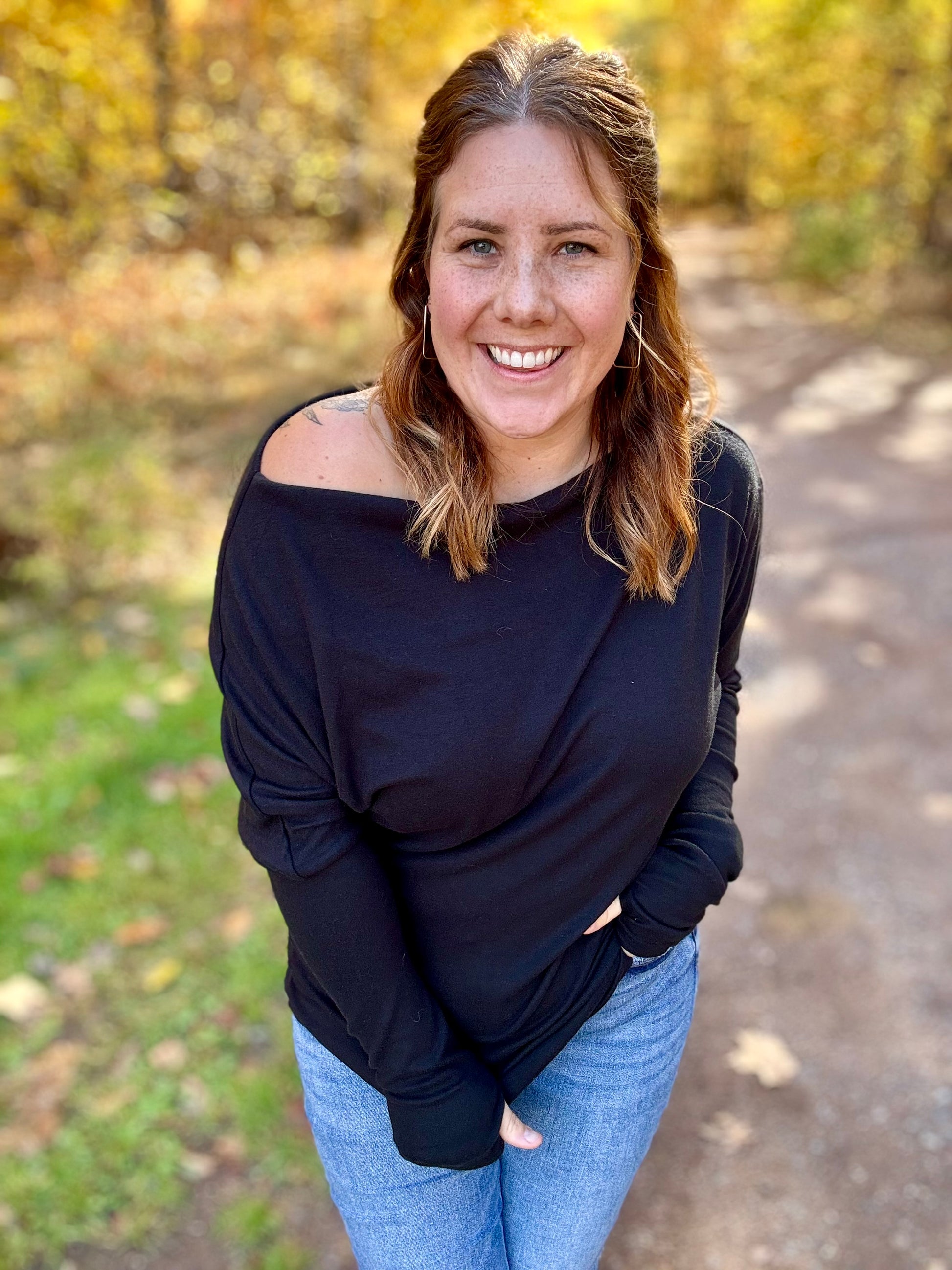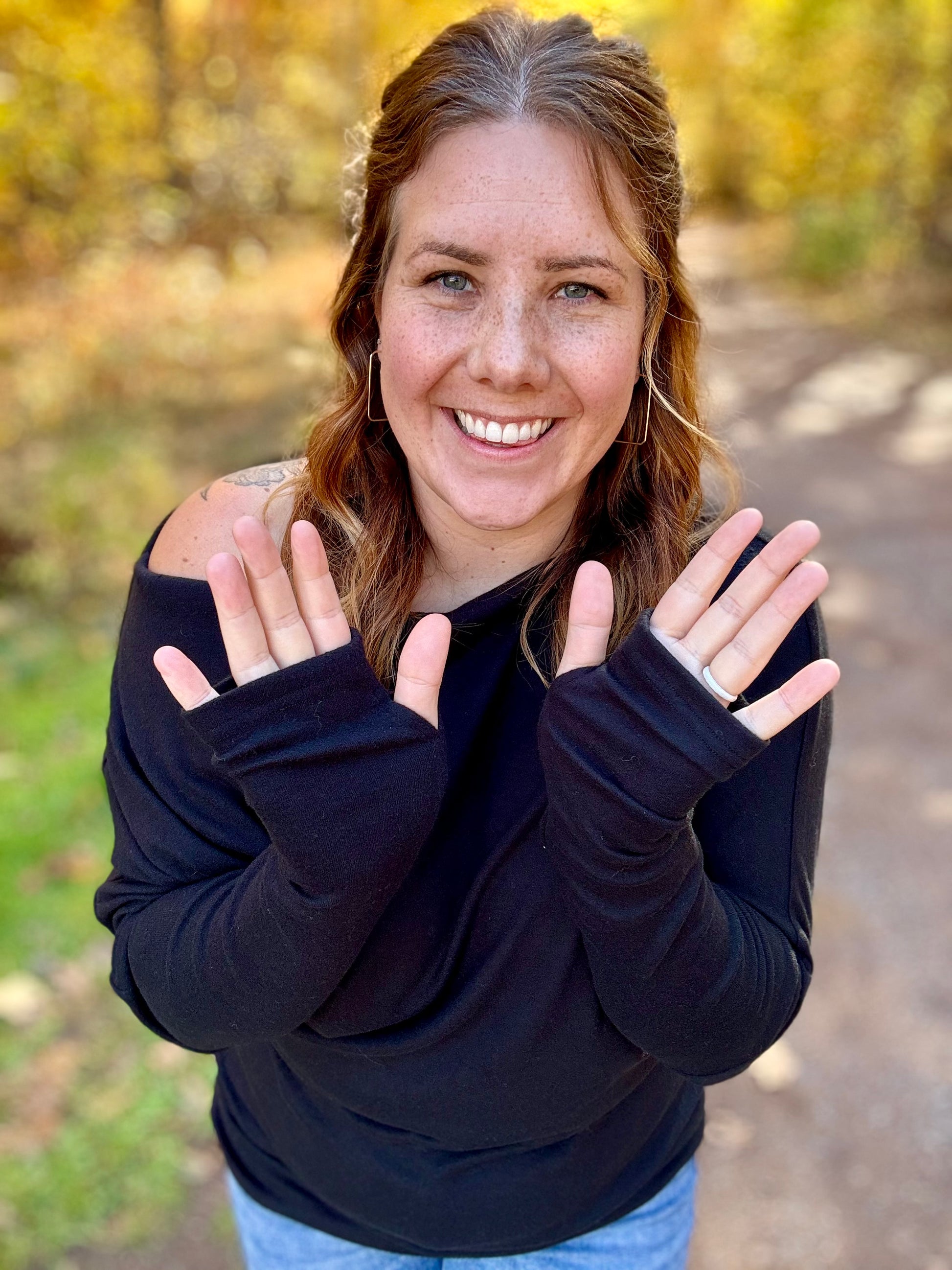 You don't need plans to wear this comfy top! Dress this one up with a pair of jeans and some cute jewlery or stay more casual with a pair of leggings. This one gives you all the options! A long sleeve solid knit off-shoulder top featuring thumb holes and a relaxed fit. Fabric is a lightweight knit.